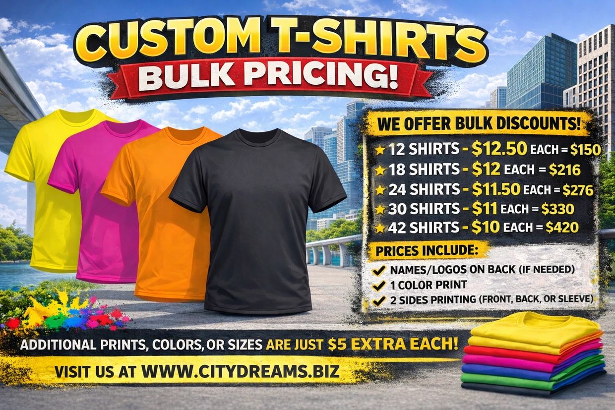 At City Dreams MMC, we specialize in bulk custom apparel designed to help businesses, schools, teams, and organizations stand out with professional, high-quality clothing. Whether you’re outfitting your staff, promoting your brand, or preparing for an event, our bulk ordering options provide the perfect balance of quality, consistency, and affordability.